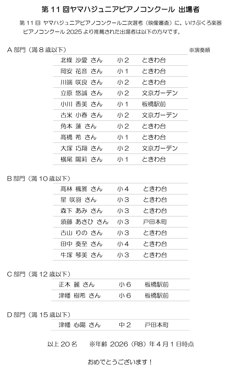 - 2025年12月01日第11回 ヤマハジュニアピアノコンクール出場者発表